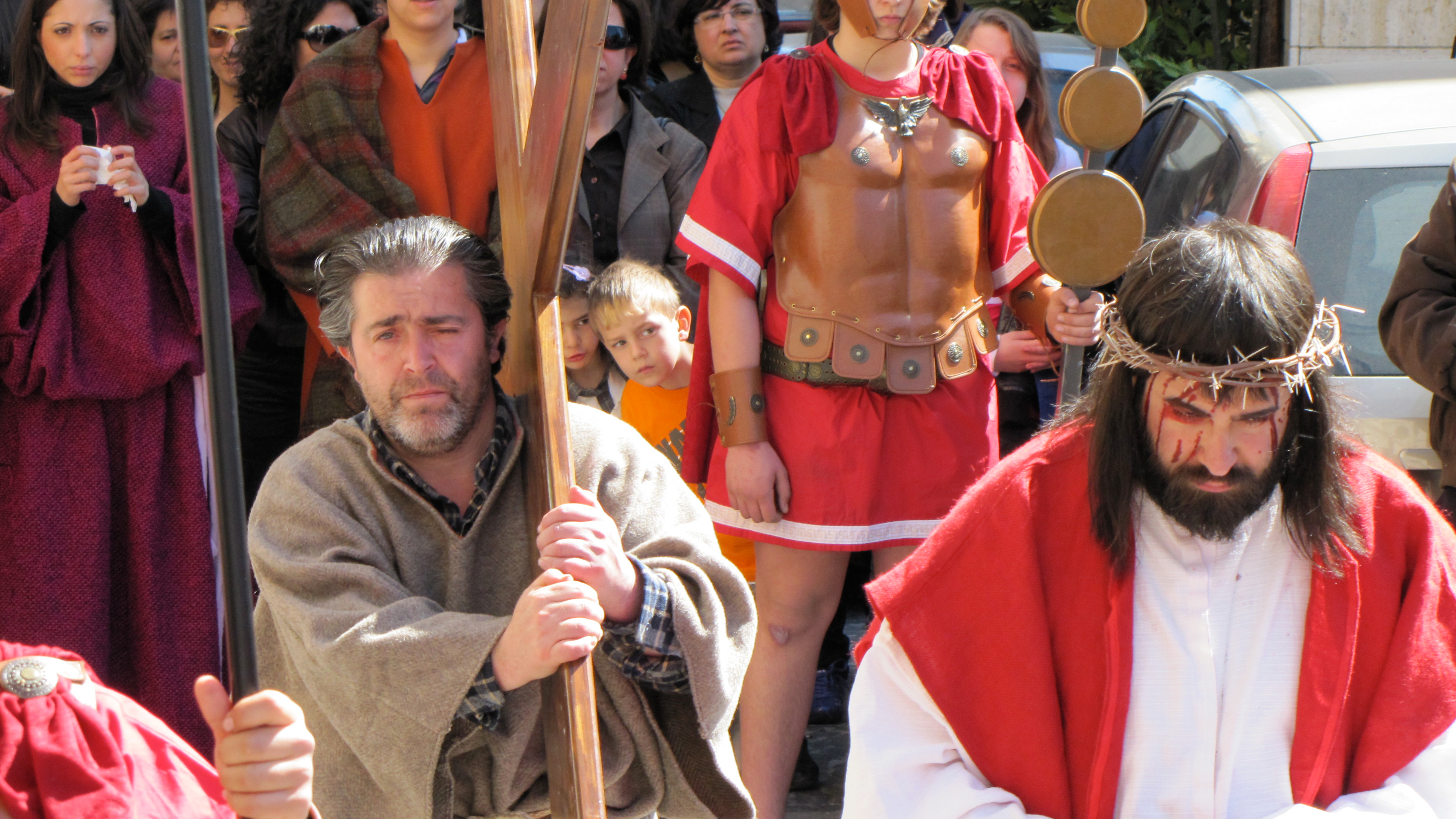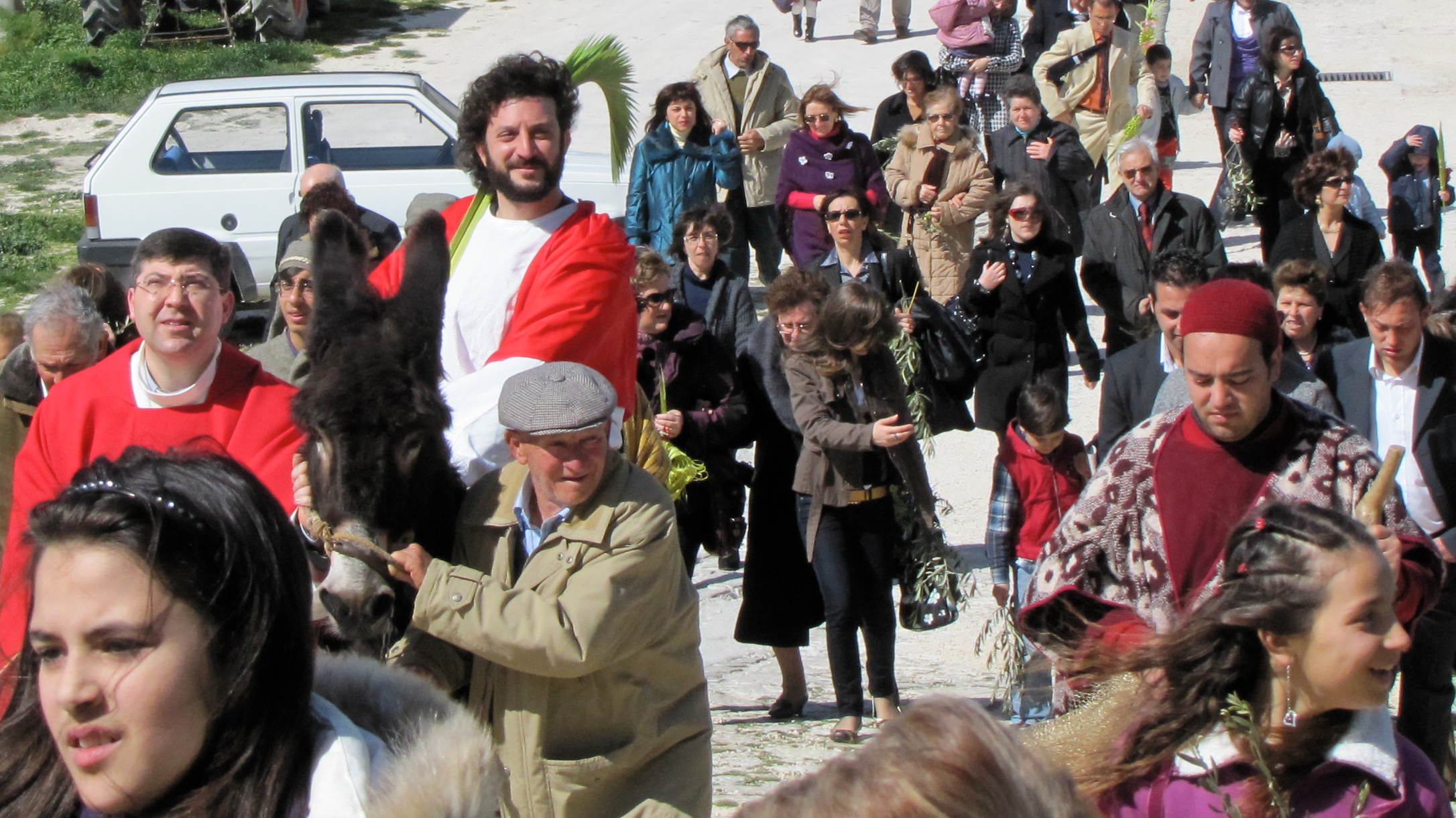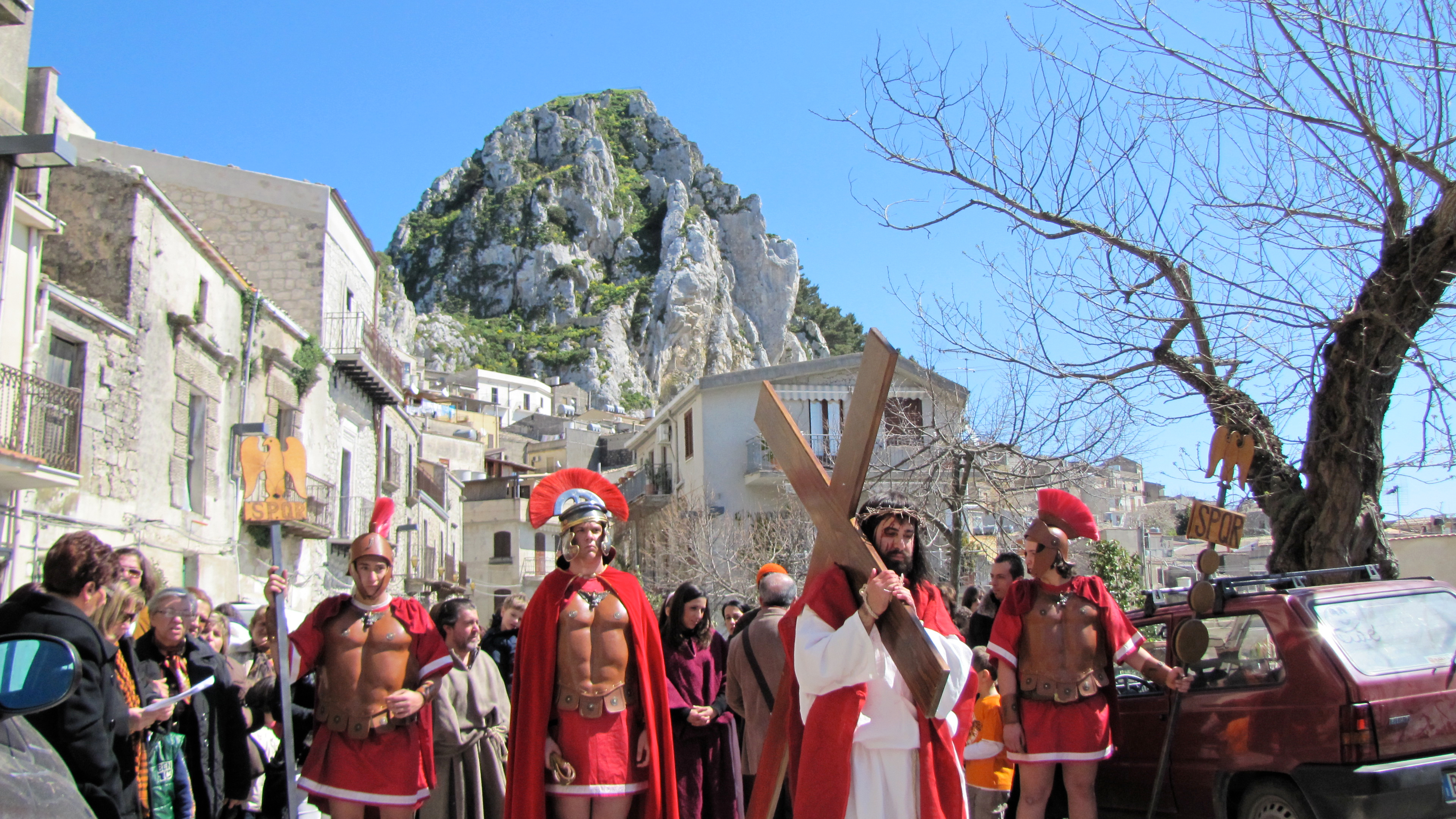 Si comincia con la Domenica delle Palme. Come in molti paesi che sono stati dominati nei secoli passati dagli Spagnoli, la Settimana Santa è costellata di rianimazioni storiche della Passione di Cristo. Nel caratteristico scenario che offre il paese, Gesù, in groppa ad un asinello, viene accolto tra le palme e gli ulivi della folla festante. La processione percorre le vie del paese, fino a raggiungere la Chiesa Madre, un libro di storia dell’arte in muratura da visitare.